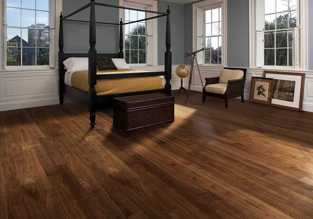 - Роскошным видом могут похвастаться лакированные массивные доски шоколадного оттенка. Такие отделочные материалы смотрятся органично не только в гостиной или в холле, но и в спальной комнате. На поверхности таких покрытий редко просматриваются грубоватые сучки и трещинки из-за темного оттенка, поэтому их можно использовать даже в богатых и вычурных ансамблях.