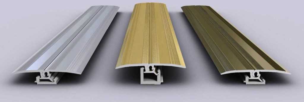Алюминиевый порожек. Используется для прямого стыка. Идеально подходит для оформления места соединения под дверью. Бывает в виде Т-образного или Н-образного профиля. Ширина «полочек» и высота самого порожка, радиус изгиба спинки — все это варьируется. В таких порожках обычно просверлены отверстия, через которые при помощи дюбелей или саморезов они крепятся к основанию. Есть еще самоклеящиеся — это самый простой в установке вариант. При монтаже, чтобы под порожек не забивалась пыль и грязь, его с обратной стороны можно промазать герметиком. После установки излишки убрать и вытереть начисто.