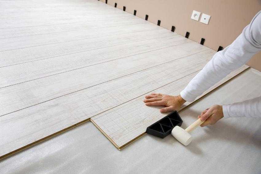 Укладка ламината осуществляется с помощью специального резинового молотка