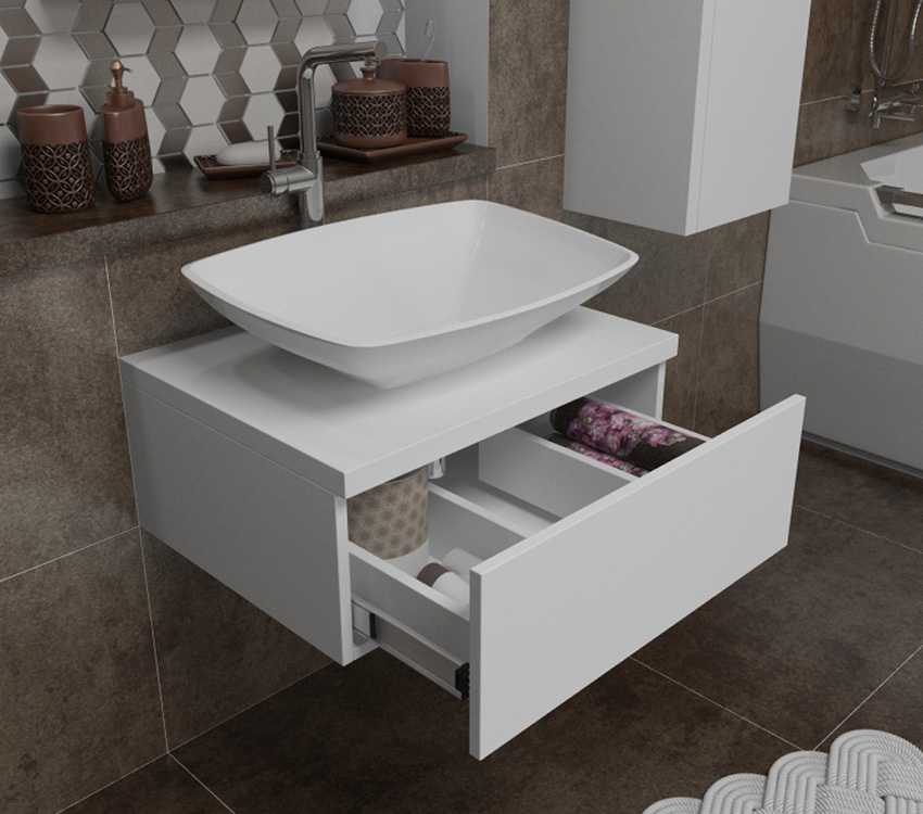Вариацией данного типа монтажа считается полувстраиваемый способ. Часть раковины ратуют за пределы тумбочки, это дает возможность занять более близкое положение к чаше. Этот метод подойдёт для малогабаритных ванных комнат, где нет возможности применять столешницу классического размера.