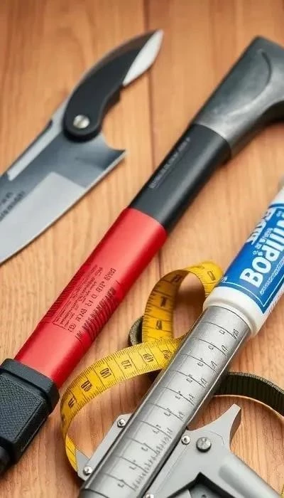 Инструменты (строительный нож, шпатель, гвоздопер, рулетка, кисть, малярный скотч)