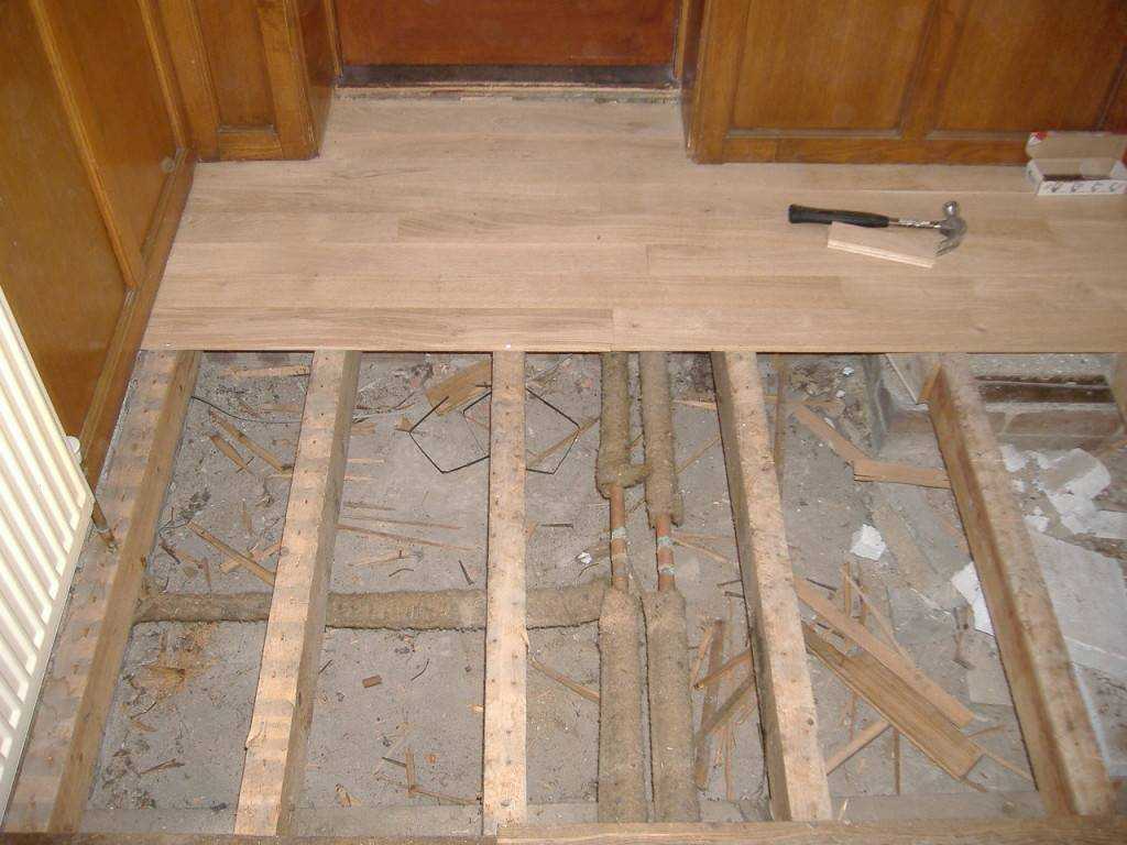 И в том, и в другом случае пол необходимо перестилать и установить между лагами дополнительно брусья. Но прежде крайне аккуратно снимают плинтуса и доски.