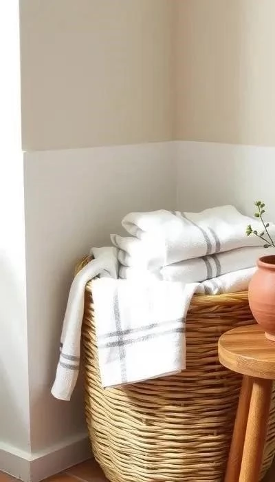 3. Ванная комната в природной гамме: В ванной комнате используйте глиняную плитку в качестве отделки стен и пола. Дополните интерьер ротанговыми корзинами для белья и полотенцами. Зеркало в ротанговой раме добавит нотку экзотики. Не забудьте о живых растениях, которые освежат пространство.