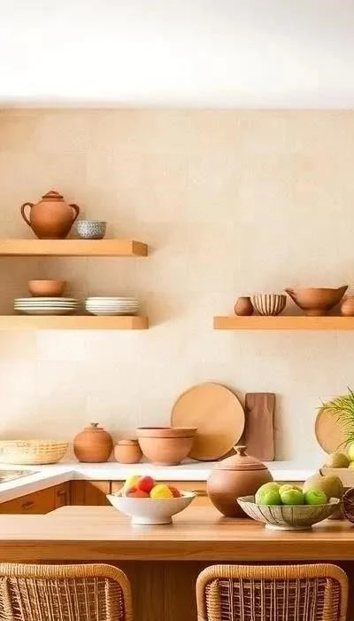 4. Кухня с деревенским колоритом: На кухне используйте ротанговые стулья вокруг деревянного стола. Посуда из глины – тарелки, чашки, вазы – станет прекрасным дополнением к интерьеру. Отделка стен – светлая глиняная штукатурка. Добавьте открытые полки с глиняными банками для специй и круп.