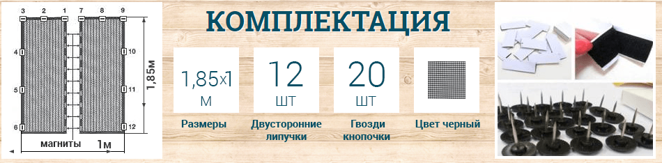 - В комплект поставки также входят крепежные элементы (специальные кнопки или липучки) с помощью которых фиксируется сетка от насекомых на дверь;