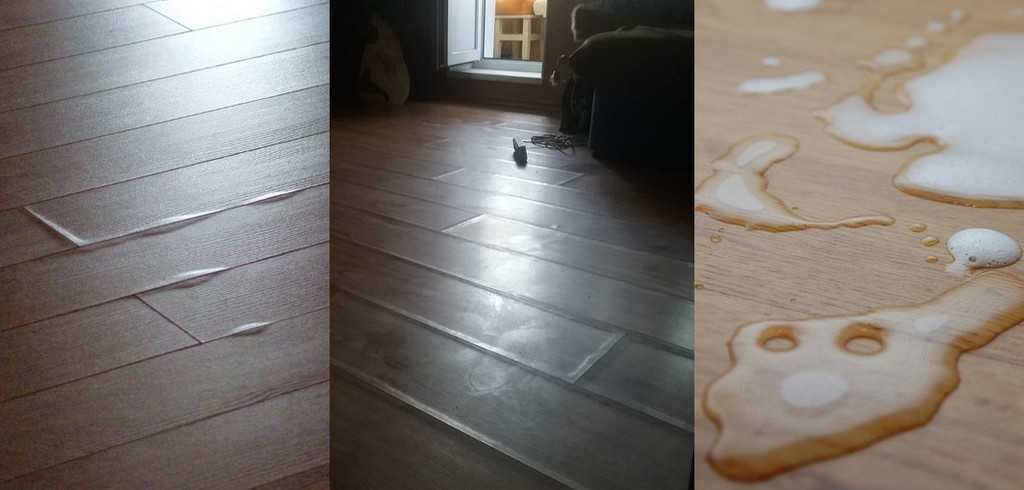 Влагостойкость – это самое слабое место ламината. Несмотря на то, что его слои сверху и снизу достаточно хорошо защищают древесную основу, пролитая вода на такой финиш должна быть немедленно вытерта. Если этого не сделать, вода может добраться до фанеры или МДФ и привести к разбуханию материала.