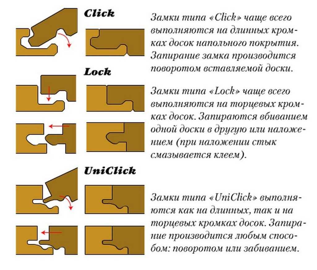 Как видно на рисунке соединение ламината выполняется торцевыми замками трех типов: