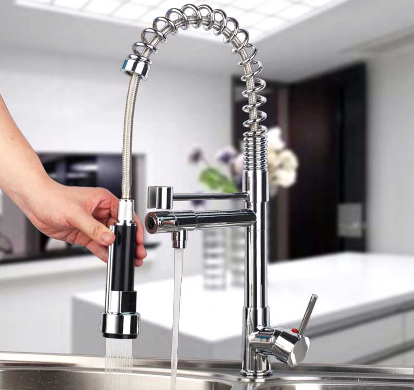 Также актуален для кухонных условий. Внешне он не отличается от своих собратьев. Но если потянуть за его конец, то можно вытянуть гибкий шланг до 70 сантиметров длиной. Он помогает мыть мойку, посуду, овощи с фруктами.