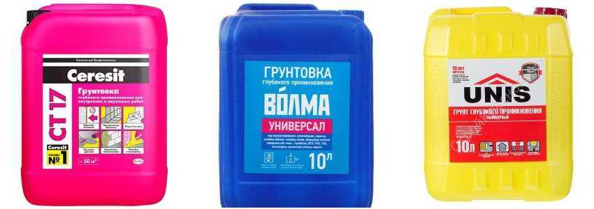 Для качественной обработки стен обычно используются грунтовки глубокого проникновения для внутренних работ — Юнис, Церезит, Волма, Бетон-контакт и другие. Можно применять клей ПВА, разведенный водой в пропорции 1:2.