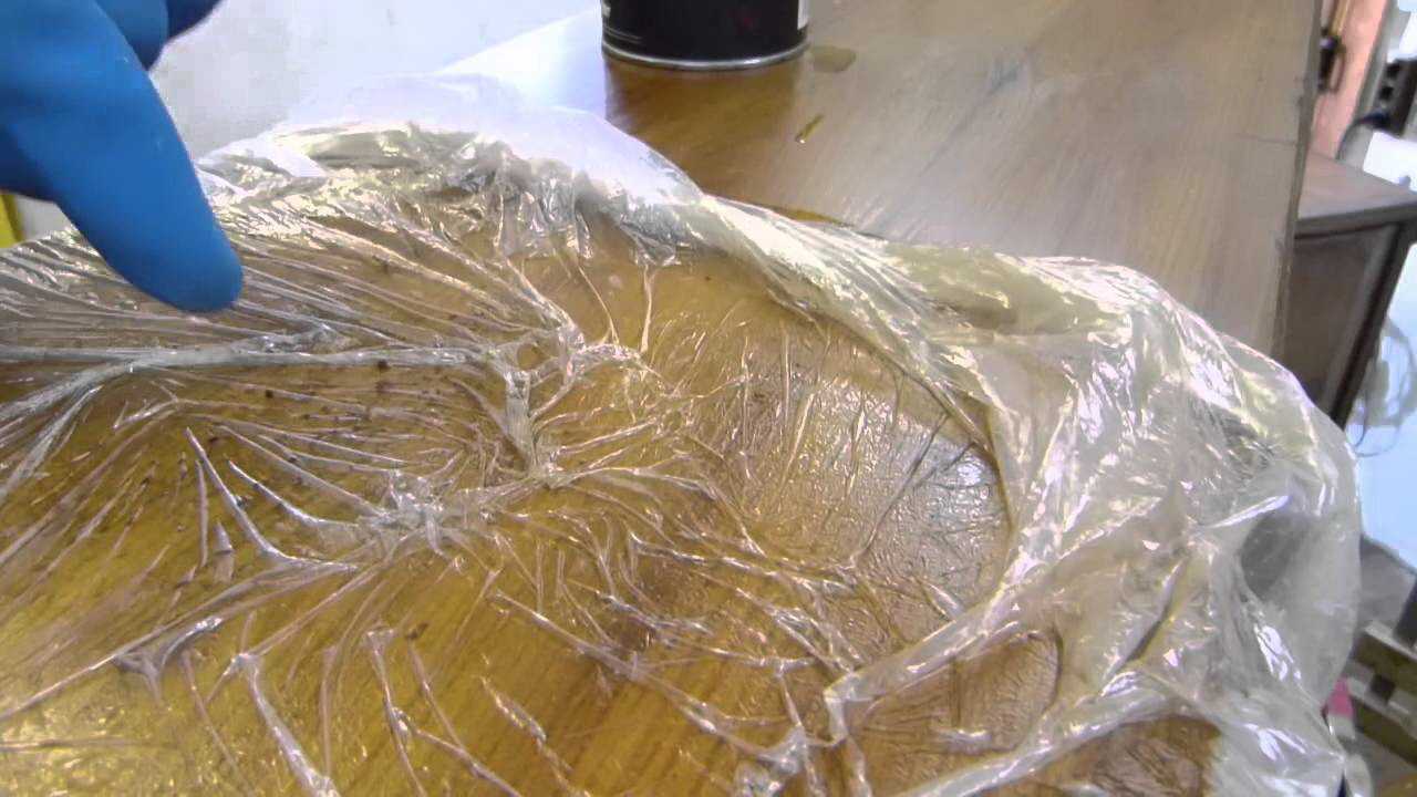 Чтобы усилить эффект смывки, организуем компресс, для чего покрываем обрабатываемую поверхность пленкой из полиэтилена. Среднее время ожидания эффекта от компресса — от 1 до 4 часов, смотря сколько слоев подлежит снятию. Хороший признак, если смывка поменяла цвет и стала темно-коричневой или буроватой, а лак начал вспучиваться.