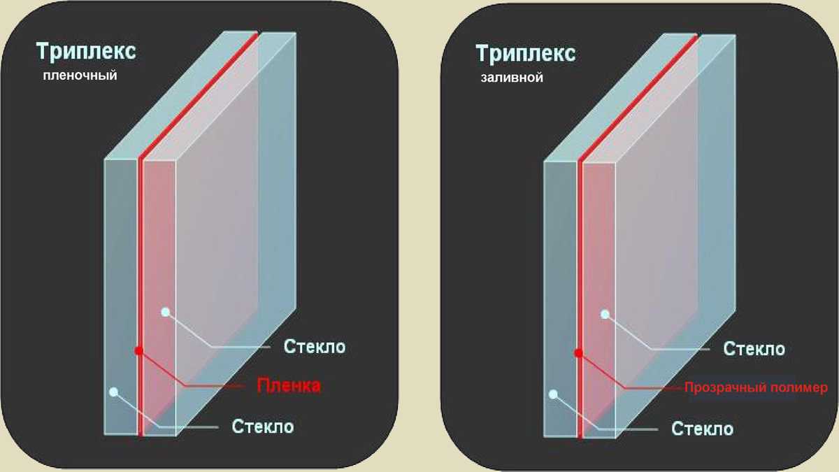 Триплекс – это два и более листа стекла, скрепленных между собой с помощью специального полимерного состава. Различают две разновидности данной технологии – с применением полимерных пленок и метод заливки специального состава. Пленочная технология предусматривает использование поливинилбутиральной пленки, которая размещается между стекол. После чего изделие проходит склейку в автоклаве.