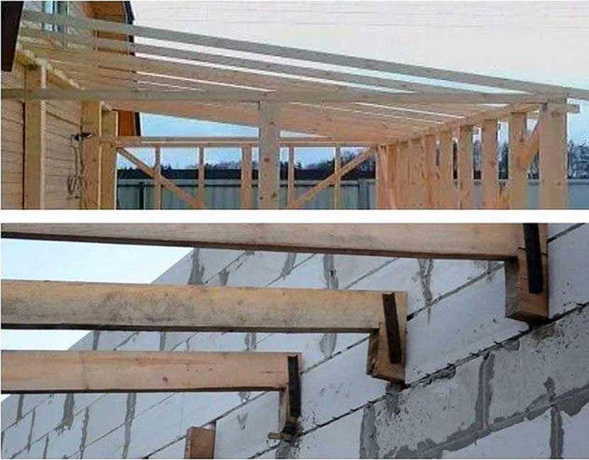 - Когда односкатная крыша примыкает к капитальной стене основного здания, стропила возможно закрепить на индивидуальные опоры или общий горизонтальный прогон. Другой край стропил укладывается на стену пристройки.