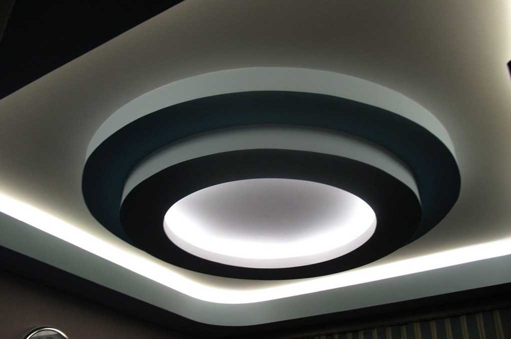 Здесь интересны варианты конструкций в несколько уровней и боковым расположением светильников в каждом ярусе в шахматном порядке. При такой конструкции получается довольно яркое освещение в помещении. Также можно скомбинировать боковое освещение со светильниками, рассеивающими свет вниз.