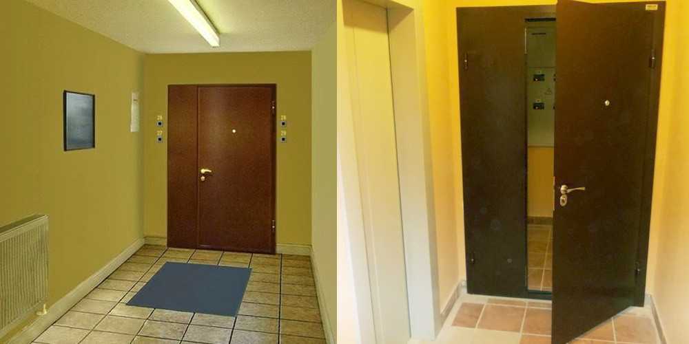 Создание небольшого тамбура на лестничной клетке значительно повышает защиту квартир от проникновения злоумышленников. Дополнительное полотно содействует изоляции от внешних шумов и еще лучше преграждает путь холоду.