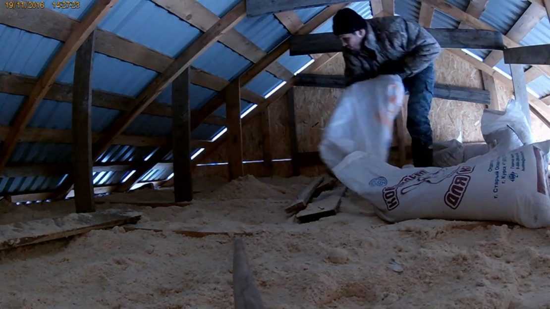 - со стороны чердака насыпать слой материала толщиной 150-200 мм;