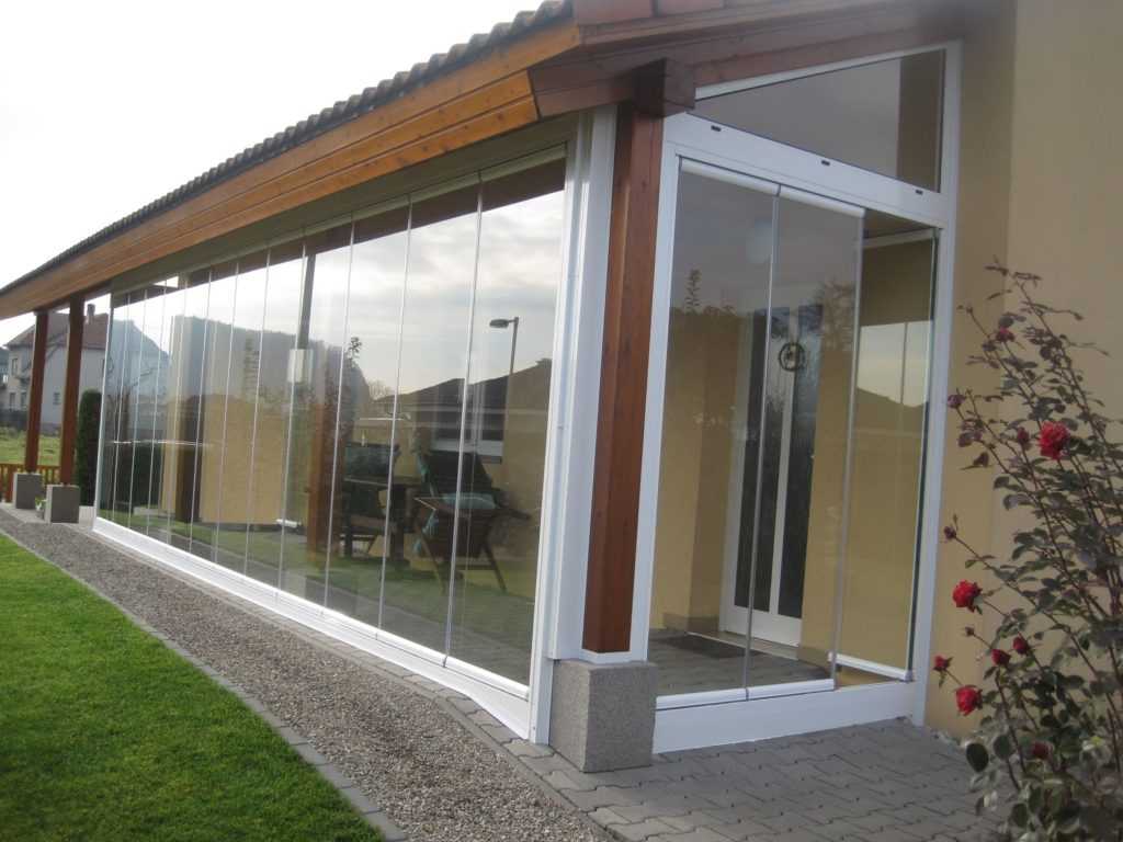 безрамное остекление – например, раздвижное остекление веранды и террасы (стеклянные плиты на роликах, которые можно смещать в стороны, делая террасу открытой и закрытой);