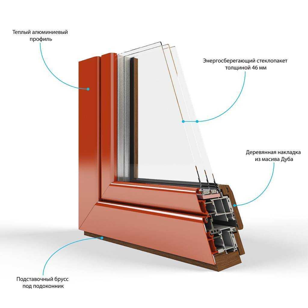 Алюминиевые накладки, закрывают всё деревянное основание снаружи. Предотвращая воздействие температуры и атмосферных осадков. Таким образом, дерево не рассыхается и не набирает влагу. Алюминиевый профиль, фиксируется на клипсах, обеспечивая защиту дерева и естественную вентиляцию. Между алюминиевым профилем и деревом устанавливаются полиамидные прокладки, предотвращающие проникновение холода в помещение.