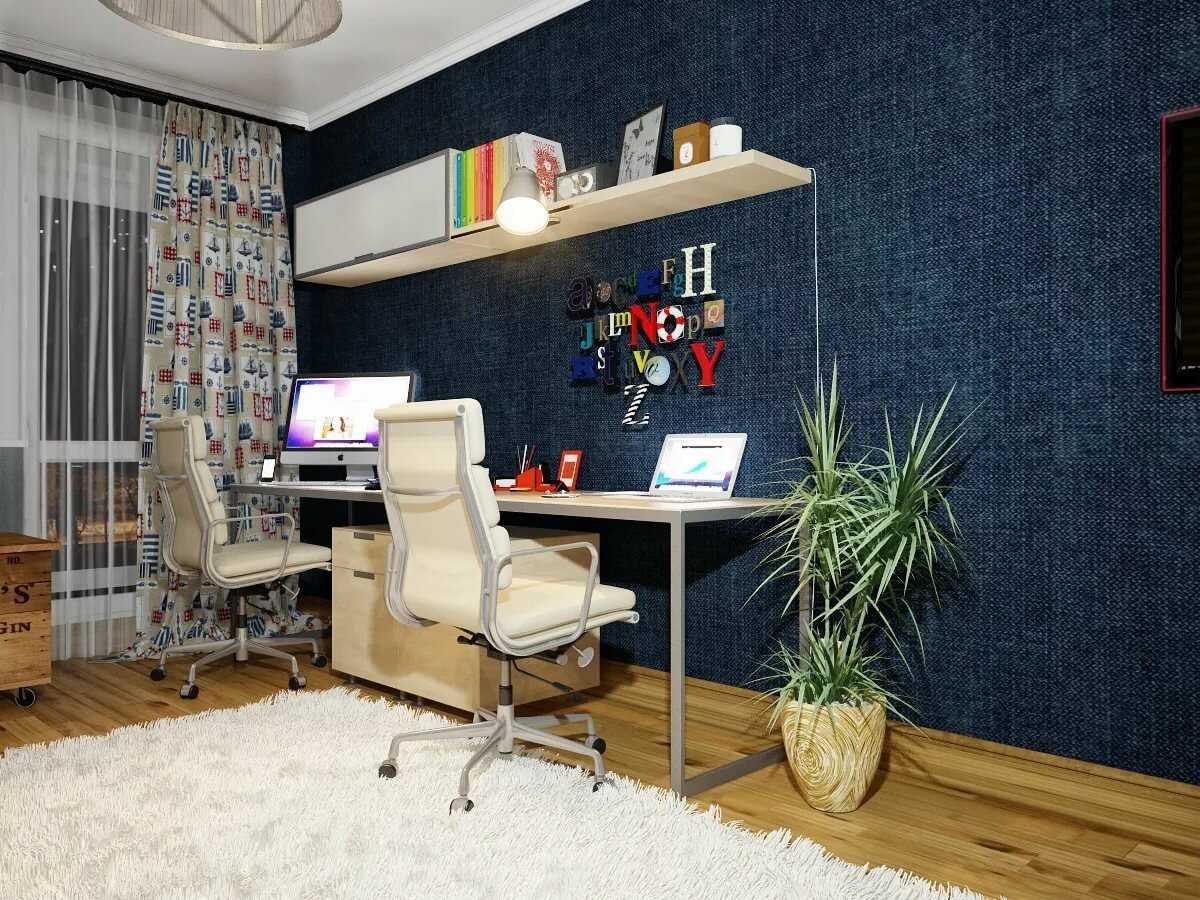 Иногда рабочее пространство необходимо организовать в однокомнатной квартире свободной планировки. В этом случае зону со столом можно расположить в углу и отгородить книжным шкафом или стеллажом, установить ширму или повесить занавески. Выделение пространства с помощью цветовой гаммы также позволит разграничить места для работы и отдыха, которые, по сути, находятся в одной комнате. Если дома еще кто-то работает удаленно, или есть дети школьного возраста, то пространство за ширмой будет разумнее поделить на два рабочих места. Тогда каждый сможет заниматься своими делами, не отвлекая друг друга.
