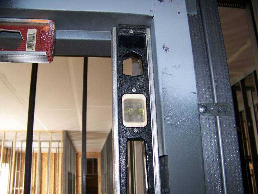 - Установка коробки (рамы). Правильность положения (совпадение плоскостей коробки и проема) проверяется строительным уровнем.