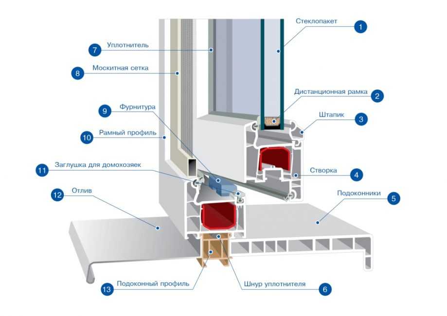 Несмотря на разнообразие брендов, каждый из которых описывает товар по-своему, система окна с профилем из ПВХ состоит из одинаковых компонентов. Внешне конструкция выглядит просто: пластиковый каркас, прозрачные окна, аккуратные ручки.