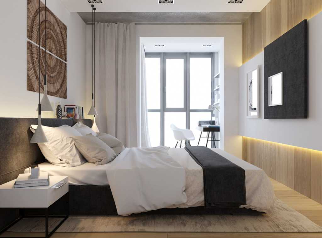 При выборе квартиры с нестандартными окнами, обратите внимание на тот вид, который будет открываться из спальни. С помощью правильных акцентов, цвета, можно создать контрастный, но при этом сдержанный интерьер, где ничто не отвлекает от основного элемента дизайна — панорамы за окном.
