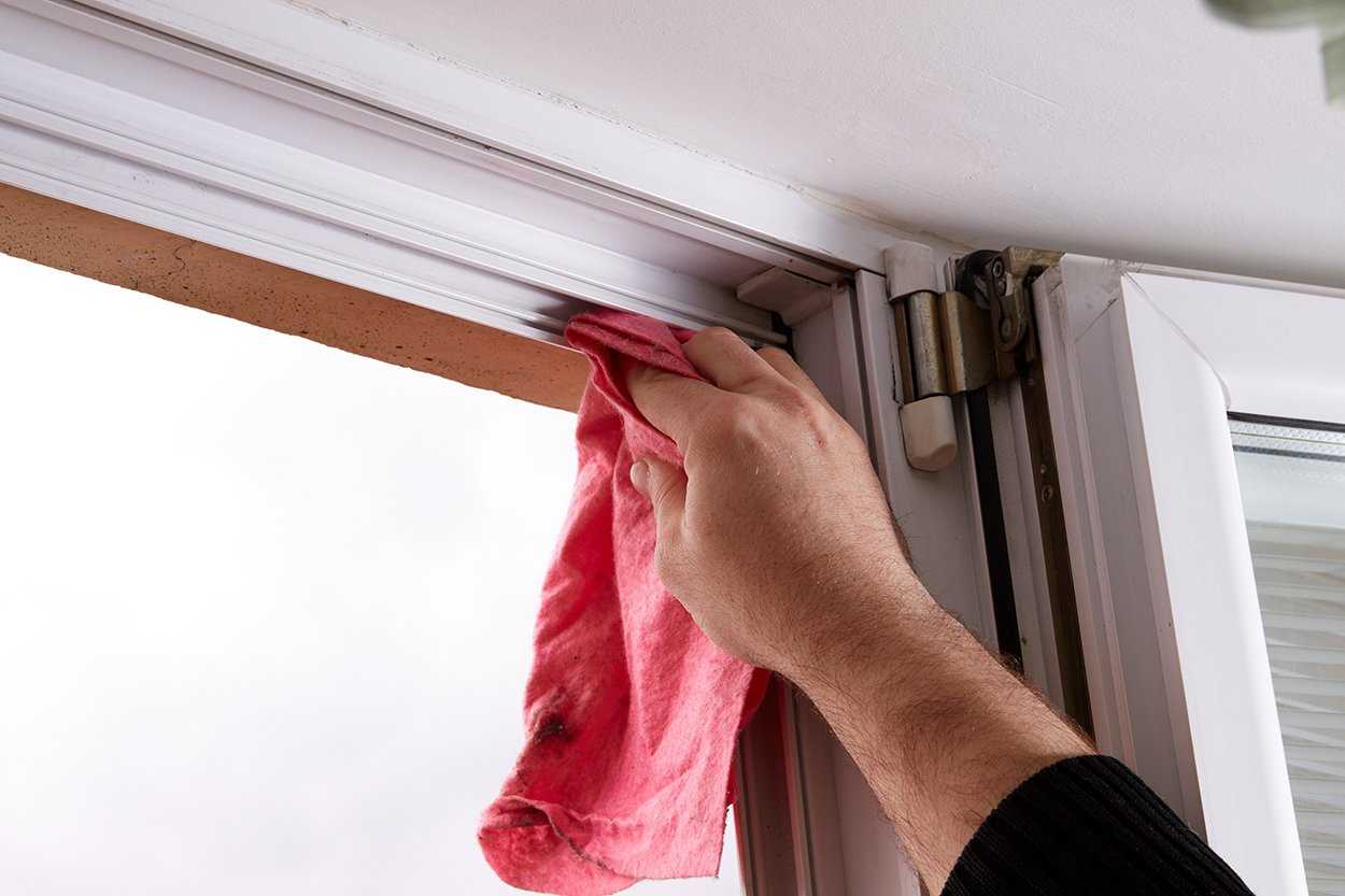 - Сначала избавляются от пыли, крупных фрагментов мусора, затем дополнительно протирают все поверхности влажной тряпкой, чтобы фрагменты пыли не ухудшили сцепление монтажной пены и герметизирующего состава с поверхностью.