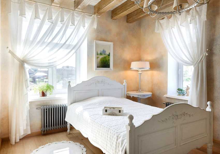 Окна, недоступные постороннему глазу, можно не закрывать плотными шторами. Для оформления оконных проемов достаточно повесить в спальне гардины. Такой вариант имеет ряд неоспоримых преимуществ, особенно если используется в небольших комнатах: