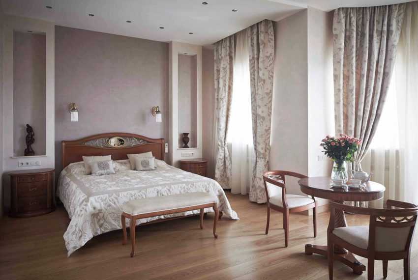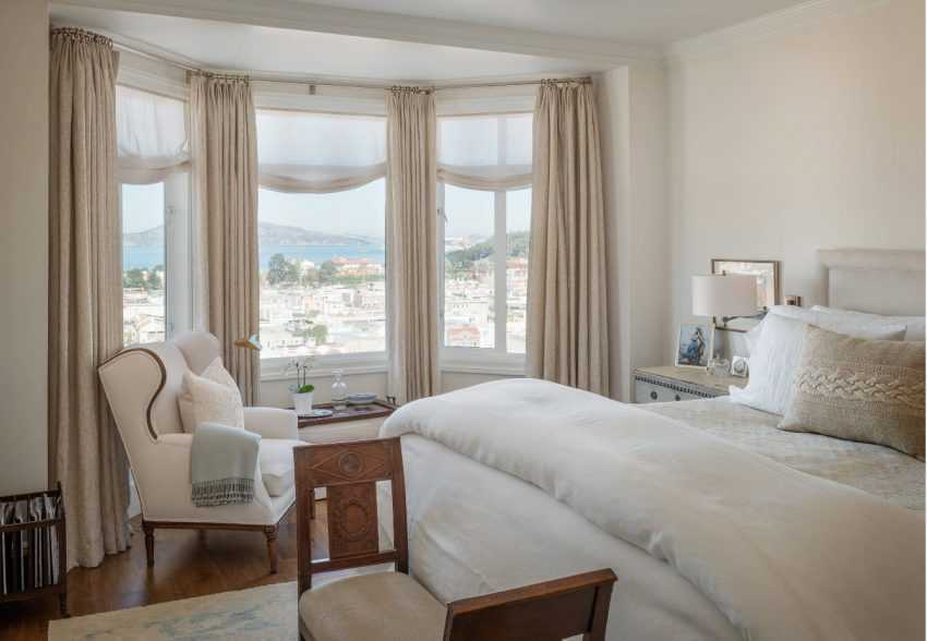 Оформить шторами эркерные окна спальни кажется сложной задачей. Обязательно создают целостную композицию, соответствующую интерьеру. Такие окна обычно пропускают достаточно света, что упрощает выбор текстиля. Здесь уместны шторы в классическом понимании. Пышное оформление смотрится величественно и колоритно.