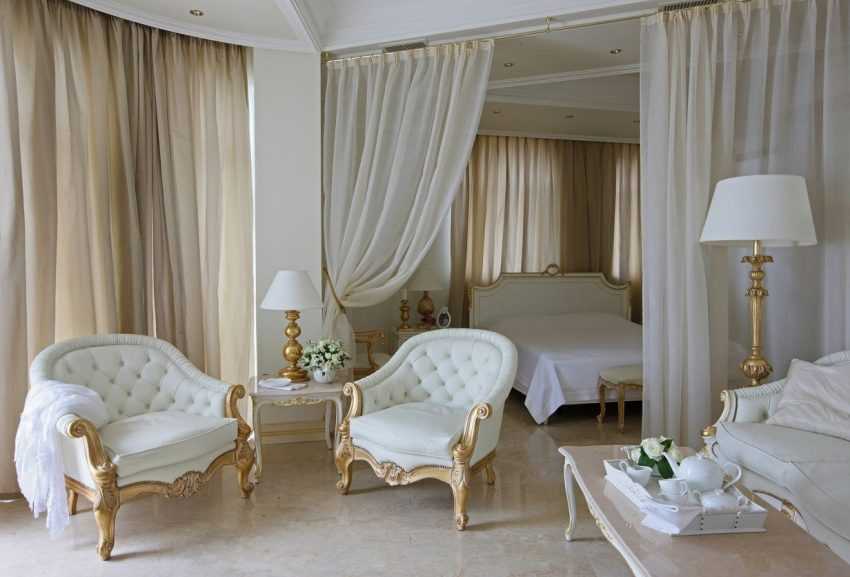 В спальне портьеры устанавливаются с белыми ровными гардинами. Полотна чаще однотонные, в нейтральных приглушенных оттенках.