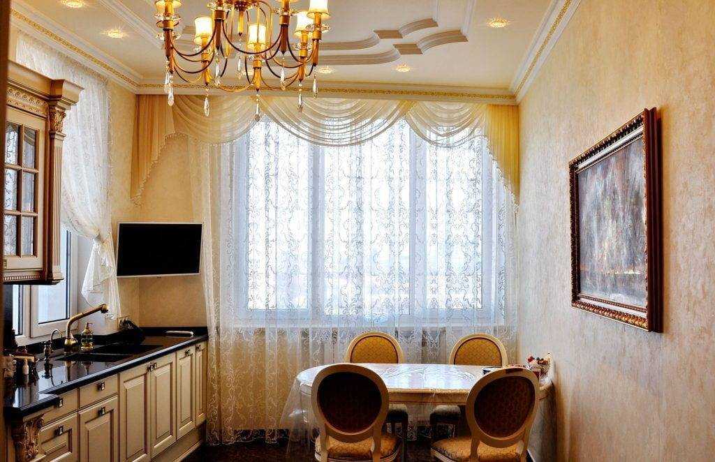 Какая форма предпочтительнее для кухни? Для маленькой кухни, конечно, простая. Так как здесь текстиль стирается гораздо чаще, чем в других комнатах, то использование слишком серьезных конструкций будет сопряжено со сложностями по уходу за ними.