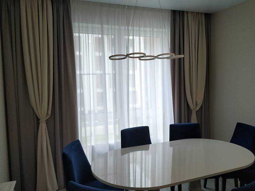Чтобы не страдать от слишком яркого света, рекомендуем использовать два типа штор. Один — легкий и прозрачный, которым можно будет пользоваться в дни с умеренной солнечной активностью, и плотный, которые будут нужны, чтобы скрыться от палящих солнечных лучей.