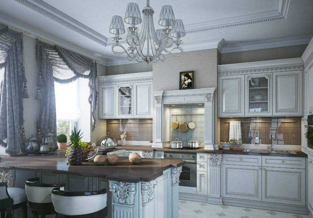Кухня в стиле может быть с яркими акцентами или полностью в черно-белой гамме. Традиционная мебель сочетается с теплыми оттенками классических цветов занавесок и ламбрекенов. В качестве расцветок выбирается клетка, полоска или однотонный материал.