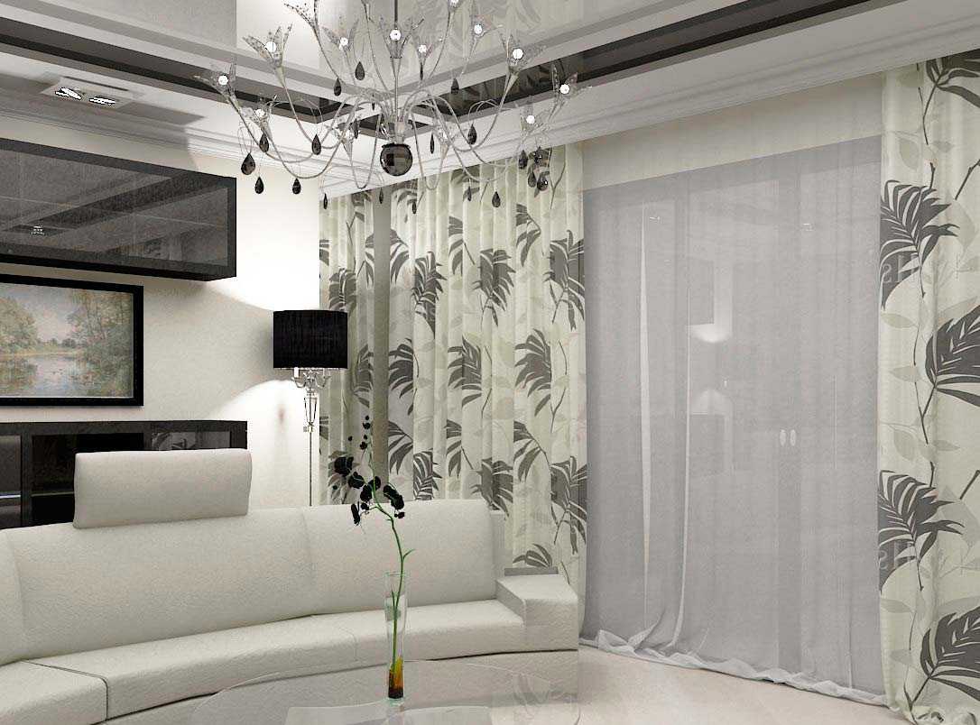 Комплектация штор в стиле модерн может включать в себя занавески из нескольких слоев, сваги, ламбрекены им различные переплетения. Украшения в данном направлении будут смотреться неуместно. Если потолок зала высокий, допускается использование гардин на люверсах. Карниз лучше всего сделать деревянным.