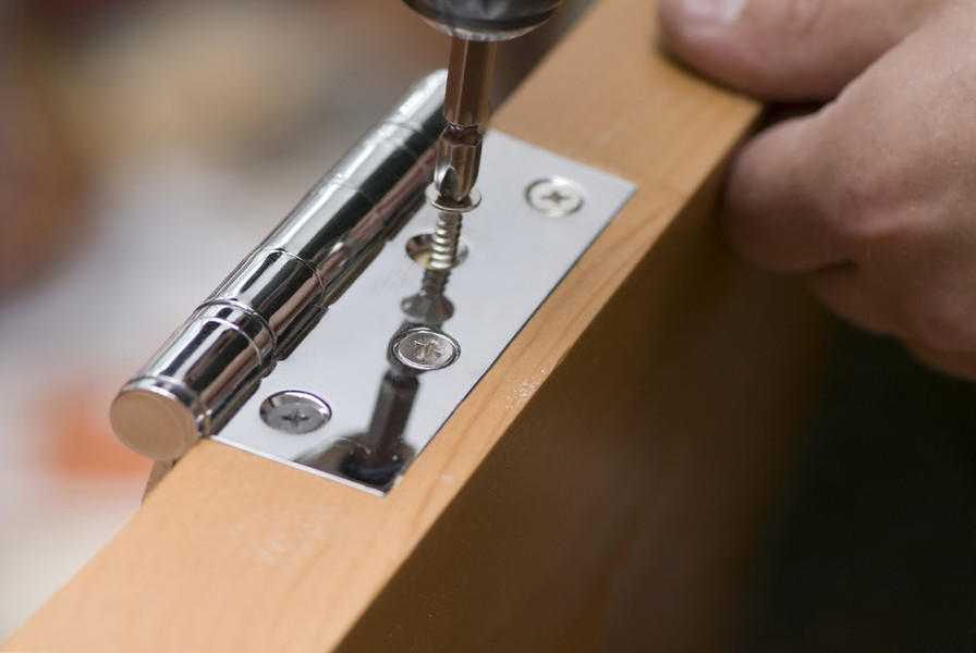 - В первую очередь следует наметить расположение петлей. В данном случае все размеры следует учитывать до миллиметров. Прикрутив новые или старые петли к коробке, необходимо наметить их расположение на дверном полотне. Далее при помощи стамески подготавливается место, где эти элементы будут располагаться на дверном полотне, после чего петли прикручиваются при помощи шурупов.