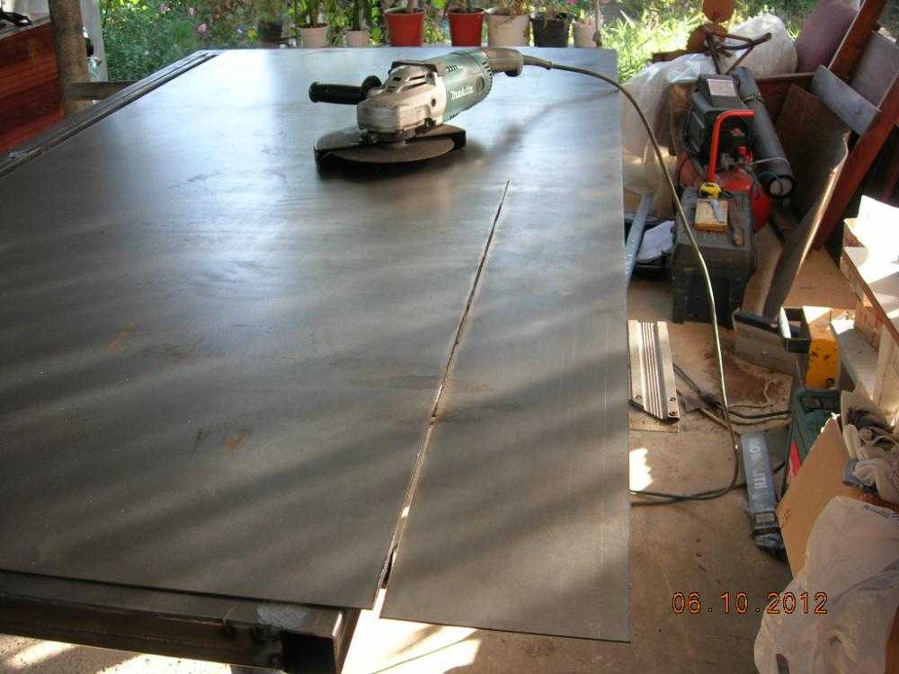 Изготовление полотна начинается с укладки стального листа на сварочный стол или козлы. Поверх листа ложиться готовая рама и чертится контур по указанным в проекте размерам, при этом от внешних краев рамы необходимо сделать отступ на 10 см.