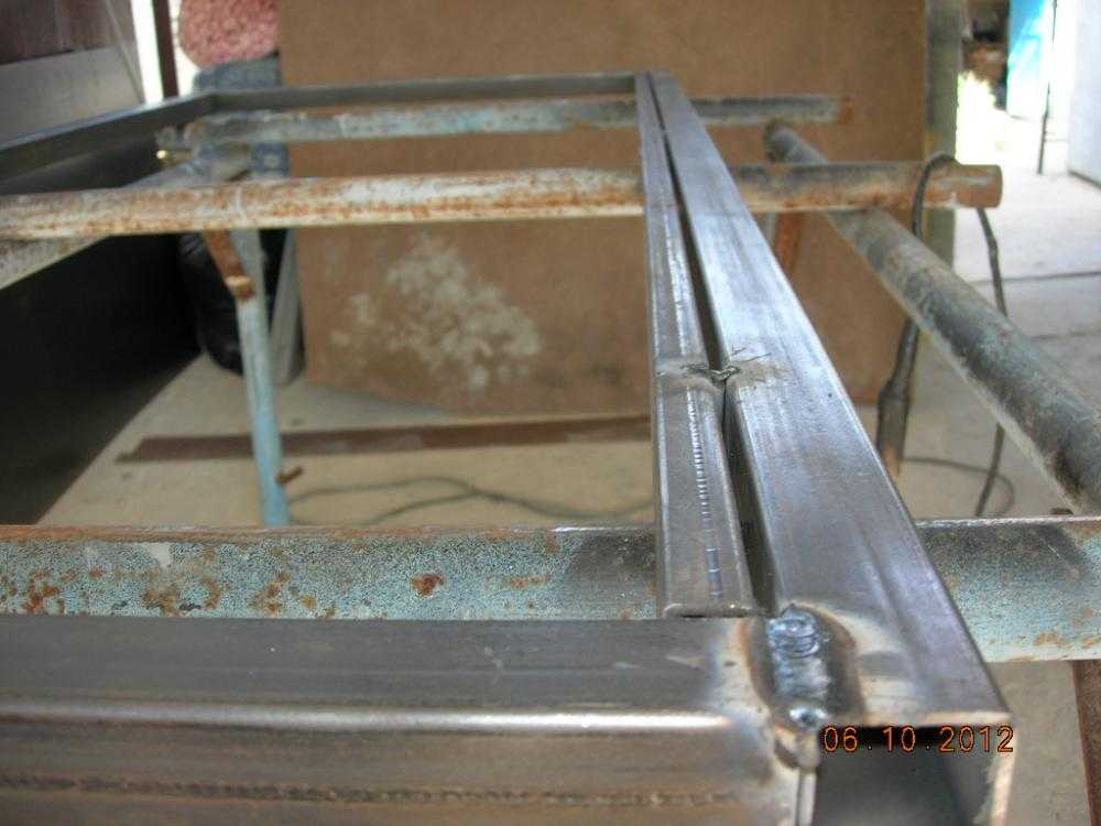 Детали каркаса нарезаются из профильной трубы и укладываются в виде прямоугольника на сварочном столе. Еще раз проверяются все размеры, в том числе и по диагонали. Контрольный замер позволит выставить углы четко под 90 градусов. Правильно скорректированная конструкция прихватывается сваркой.