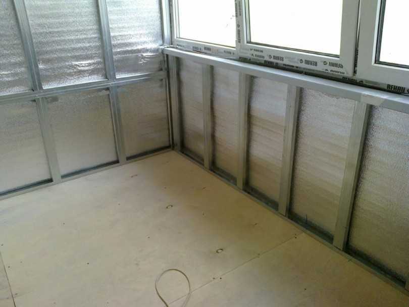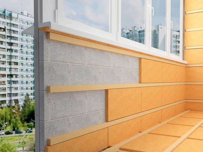 Перед утеплением лоджии изнутри стены тщательно очищаются, обрабатываются биосептическими средствами, чтобы защититься от грибков и плесени. Далее набиваем на стены обрешетку. Толщина брусьев должна быть на 5 мм ниже теплоизоляционной плиты. Прикрепляем плиты с помощью пистолета пенным клеем, а затем закрепляем пластиковыми дюбелями со стопорными винтами.