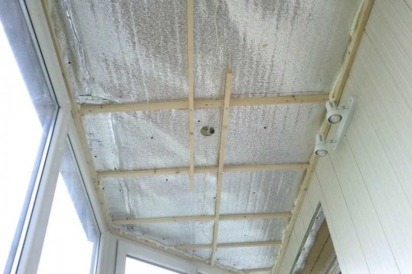 - создав деревянную обрешётку (подробнее в статье “как сделать обрешетку на балконе“), мастер заполняет каждую ячейку утеплителем;