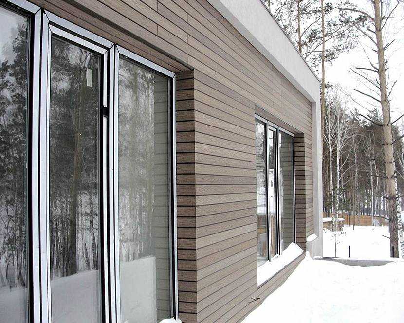 - Фиброцементный сайдинг и обшивочная доска из ДПК (древесно-полимерного композита). Приблизительно одинаковые по стоимости материалы – 1000-2000 руб./м2. Главная причина высокой стоимости – импорт. Но если сравнивать с зарубежным виниловым цокольным сайдингом, то это та же ценовая категория.