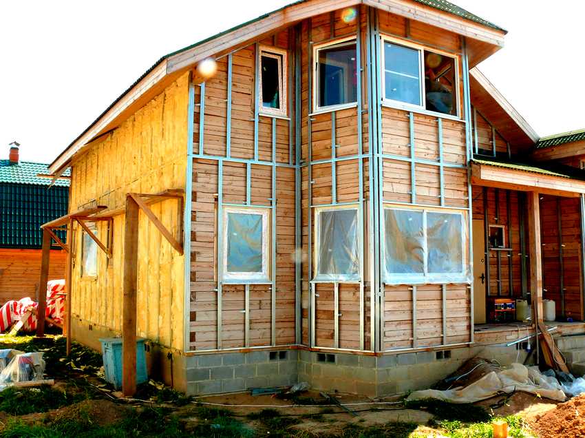 Затем на рейки монтируется сайдинг или укладывается армированная сетка с дальнейшим оштукатуриванием поверхности.