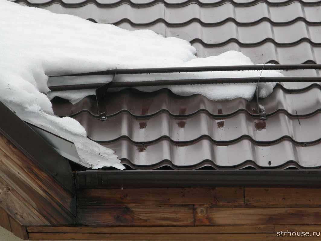 Уже самая ее конструкция предполагает то, что снег по ней будет сходить очень часто, а ее гладкая поверхность не может самостоятельно задерживать снег. Днем он начинает таять и сходить пластом, а это может привести к появлению царапин на поверхности металлочерепицы, что в свою очередь приведет к коррозии и порче покрытия.