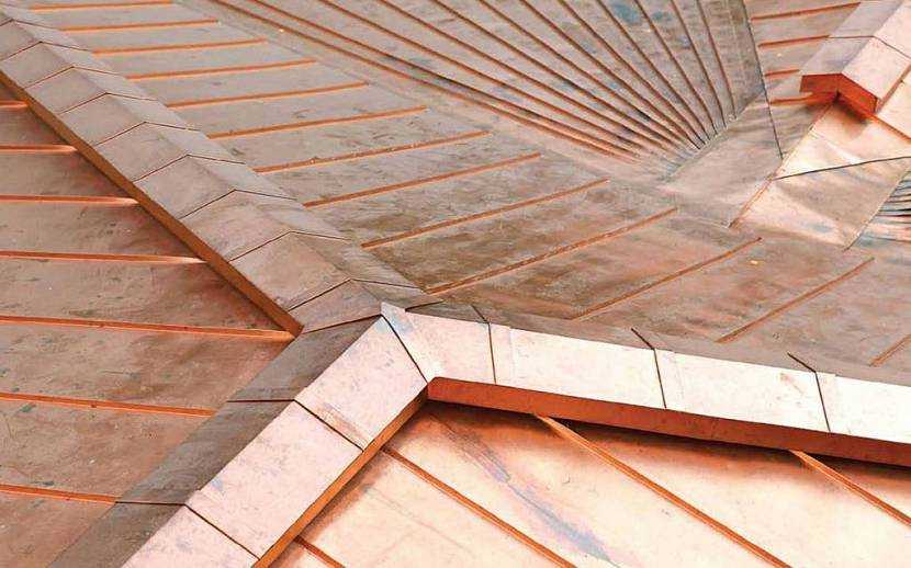 Медь. Кровельные материалы на основе этого металла выпускают в рулонах. По фактуре кровельная медь может производиться в нескольких вариантах: имитировать каменную кладку, черепицу и т.д. Благодаря своим физическим свойствам медь с легкостью поддается спайке, что в значительной мере облегчает проведение монтажа и повышает степень надежности кровельного покрытия.