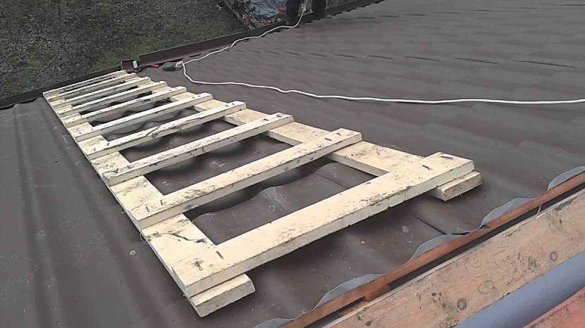 Изготавливаются самостоятельно, применяются для упрощённой передачи элементов кровли на крышу. Две доски сшиваются вместе так, чтобы их ширина соответствовала размерам фрагментов металлочерепицы. Длина направляющих должна быть достаточной для того чтобы их можно было опереть на крышу под углом не больше 45 градусов.