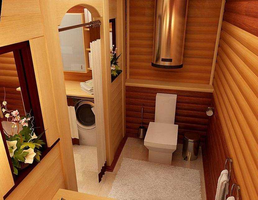 Покрытие стен санузла сделано из панелей под древесину, полы кафельныеИсточник arxip.com