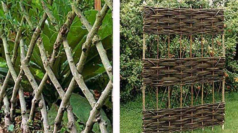 Заборы делают из подручных материалов, например, распила брёвен. Органично впишется в природную стилистику плетень.