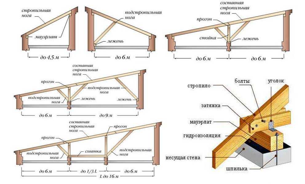 В противном же случае стропила подпираются при помощи подстропильной ноги – это брусок, нижний конец которого опирается на лежень. Последний же представляет собой дополнительный опорный элемент, зафиксированный вдоль стены, имеющей большую высоту. Данная рекомендация актуальна для случаев, когда пролет между соседними стенами составляет 4-6 м.