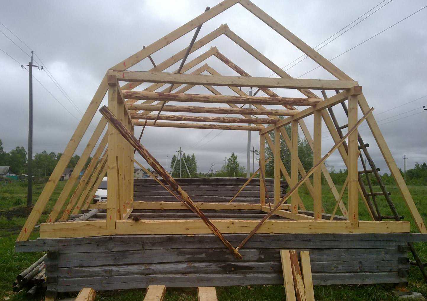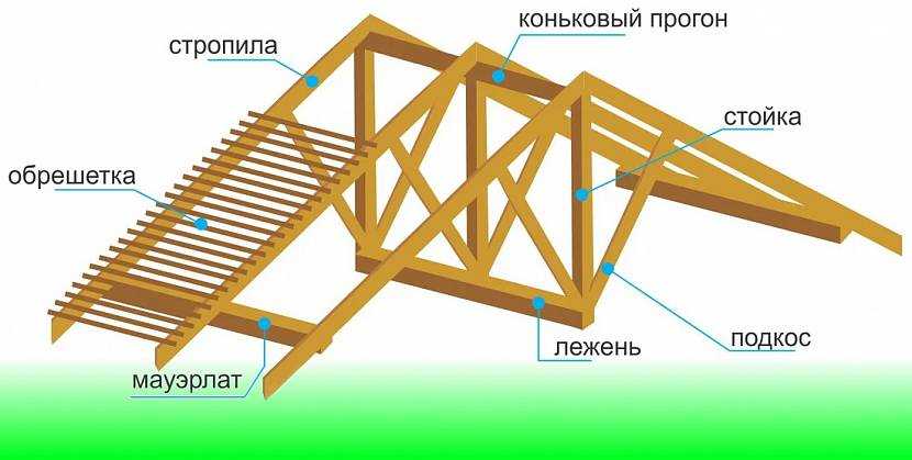 - Стойки. Вертикальные брусья, расположенные на торцах лежня. Высота стоек определяет угол наклона скатов.