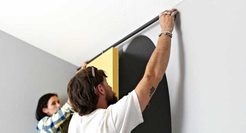 Начало монтажа дверей купе предусматривает нанесение разметки на стену для верхнего бруса. Створку плотно прислоняют к проёму. С учётом ширины рельса и зазора 5 мм на стене отмечают границу расположения балки. Полотно отставляют в сторону. По отметке проводят горизонтальную линию.