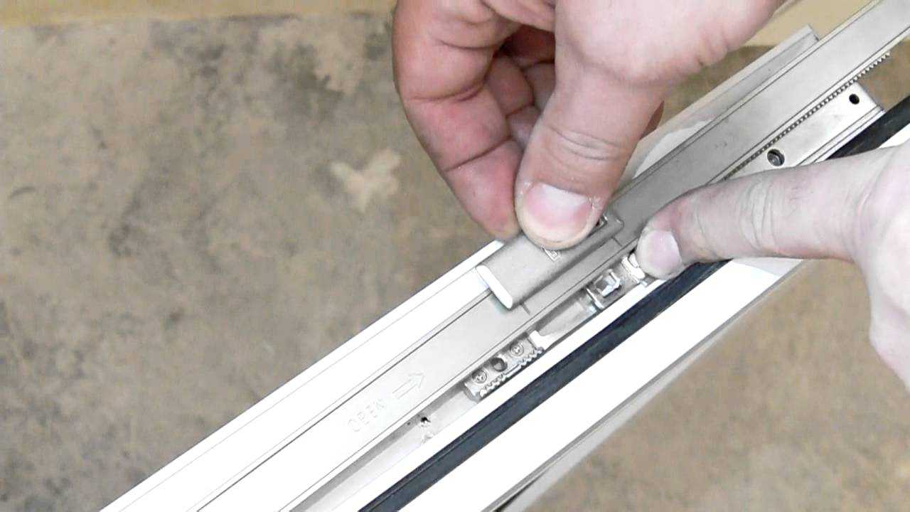 - Направляющую устанавливают на торец нижней части створки внутрь заранее прорезанного паза.