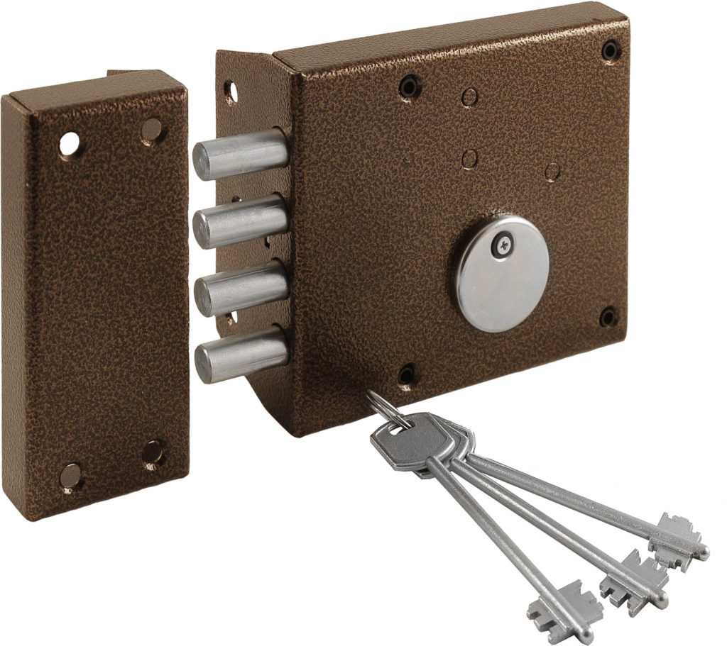 На современных накладных замках с цилиндровыми механизмами закрытия двери предусмотрена дополнительная защита. Для них изготавливаются ключи с боковой перфорацией, а саму личинку изделия невозможно высверлить.